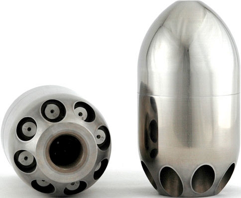- Оптимизированная система "3D Гидромеханикс": насадки для очистки канализационных сетей были разработаны с использованием оптимизированного "3D Гидромеханизма" – вода, выходящая из шланга высокого давления, плавно поворачивается на 180º, поступает во внутреннюю полость насадки и направляется непосредственно в керамические сопла по пяти осевым каналам (отшлифованных и с высокой точностью обработанных на станке типа CNC), а не трубок или желобов