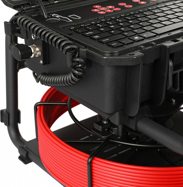 - Головка камеры Ø 21 × 45 мм и проталкиваемый кабель Ø 5,3 мм × 40 м из стекловолокна со счетчиком длины, подходящие для труб Ø 50 – 125 мм, длиной до 40 м