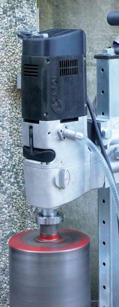 Модель снята с производства! Профессиональная установка алмазного бурения Cardi 351 (Карди 351) с четырехскоростным сверлильным двигателем 3,2 кВт и стальной сверлильной стойкой предназначена для сверления отверстий алмазными бурильными коронками с подачей воды в бетоне, железобетоне любой степени армированности Ø 25 – 350 (макс. 400) мм, а также в асфальте, кирпиче, камне и т.д. Ø 25 – 400 (макс. 450) мм под углом 0° – 75°.